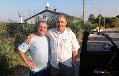 | O 1º. cabo Grácio e o furriel Viegas, em Amor (Leiria), em Setembro de 2013, 38 anos depois do regresso de Angola. Atrás, a casa do Grácio |