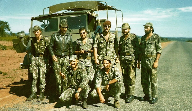 Cavaleiros do Norte da 1ª. CCAV. 8423 em turismo para as Quedas do Duque de Bragança: Almiro Maciel, furriel João Dias, alferes José Lains, furriel Évora Soares, Carlos Coelho e Famalicão (de pé), Carlos Costa e Fernando Silva |